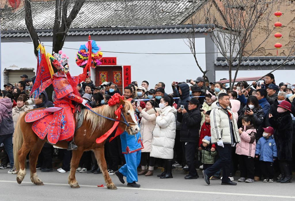 2月12日,游客在陇县元宵节社火巡游活动上观看马社火表演。 新华社记者 邹竞一 摄